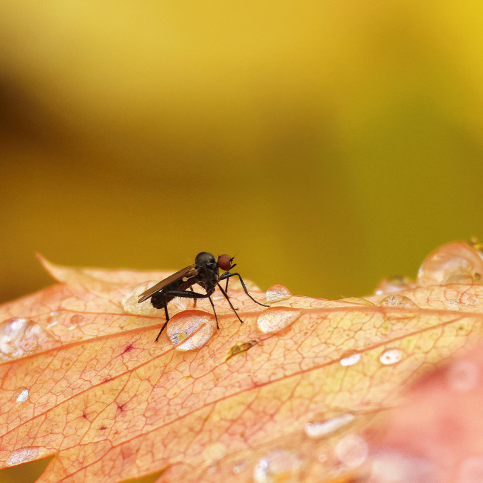 1. Pieni, Juha Merenheimo. Lehdellä on pieni hyönteinen. Syksyinen värimaailma on onnistunut ja tausta on sopivan pehmeä, yllättävä kuvauskohde.