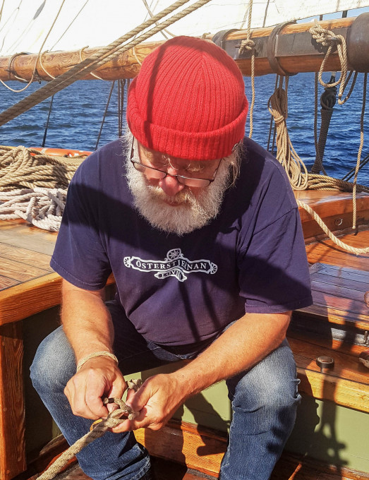 2. Puosu, Seppo Oinonen. Hieno tilannekuva on köyden kanssa askaroivasta vanhasta merimiehestä.