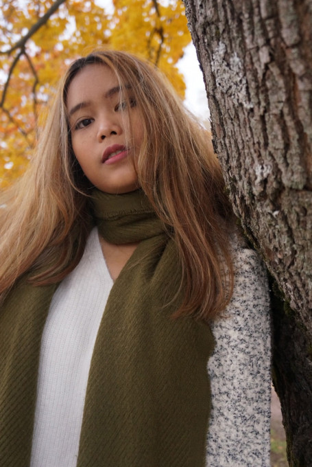 3. Rento syksy, Sara Lindborg. Kesän vihreydestä on vain muisto jäljellä vihreässä kaulahuivissa. Taustan oksiston lehdet tuovat viestin syksystä.