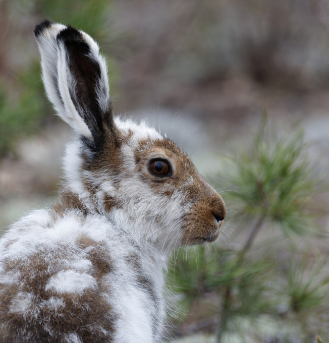 4. Metsäjänis, Juha Merenheimo. Rusakoksi tätä ei voi luulla, kaunis taiteellinen kuva metsäjäniksestä, jolla turvapuvun vaihto on vielä kesken.