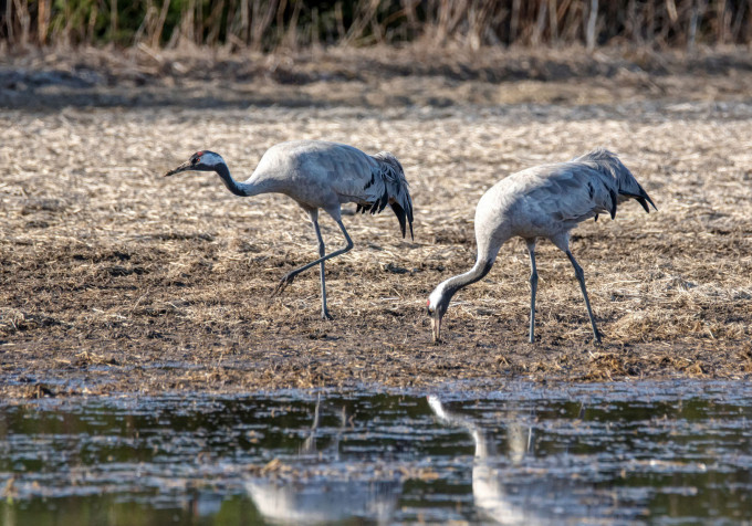 5. Kurkipari, Heikki Arola. Kauempaa kurjen tunnistaa pyrstön päällä roikkuvasta ”puuhkasta”. Tässä Pohjois-Afrikasta palaavat kurjet ovat ruokailemassa Marinkylän pellolla.
