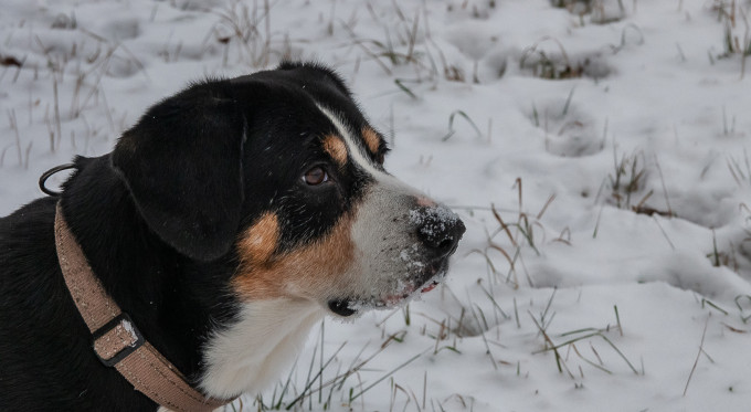 6. Kullanmuru, Leif Rosqvist. Hellyttävä kuva koiran kasvoista, jota elävöittävät taustan lumen alta pilkottavat heinän korret.